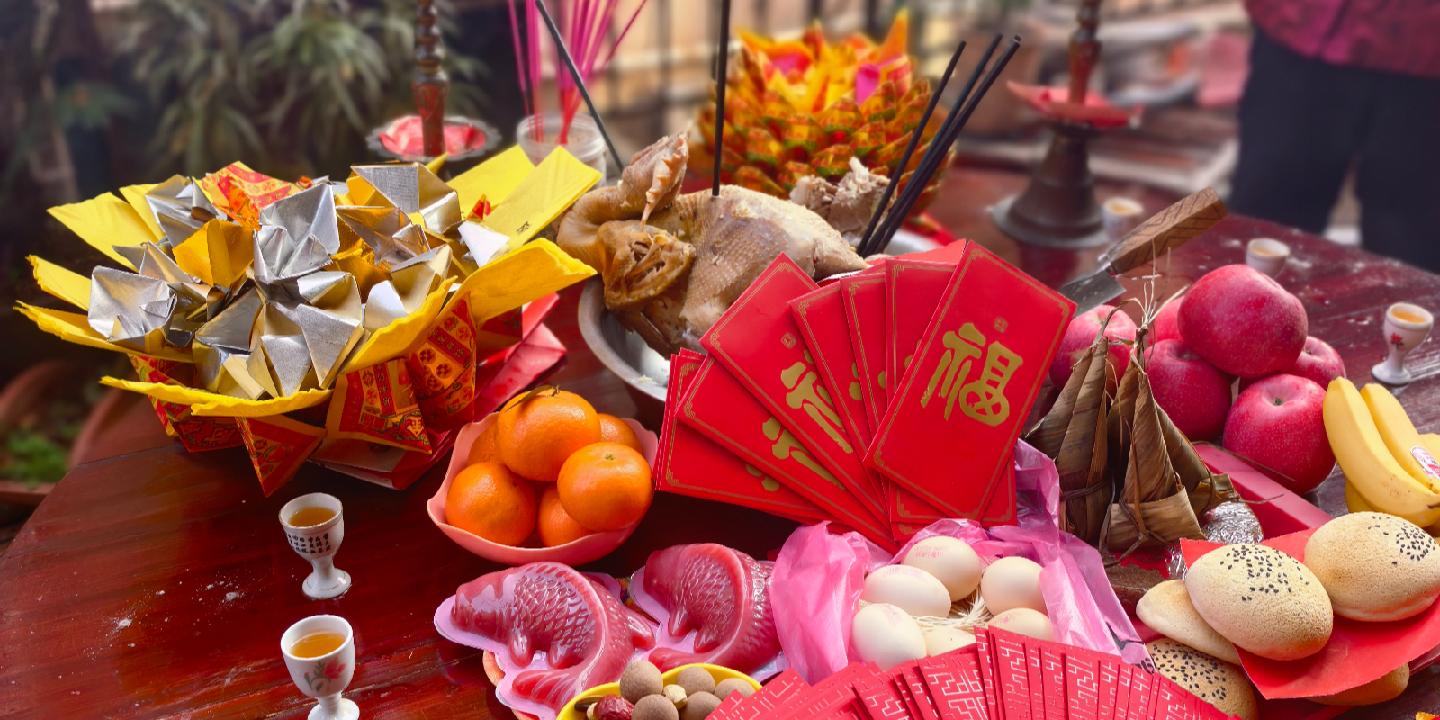 桔子、苹果、香蕉、菠萝等水果是不可少的,近年来火龙果也被摆上供桌,因为它寓意红红火火;酒杯也是不可少的,一共12杯酒,左边6杯右边6杯,有些人省略了往酒杯倒酒——这个每隔半小时要感谢一次的环节;年糕、豆腐、鸡蛋、土面都被摆上了供桌;麻酥(一种永康小吃)、粽子、瓜子、花生、糖果也摆上了供桌。